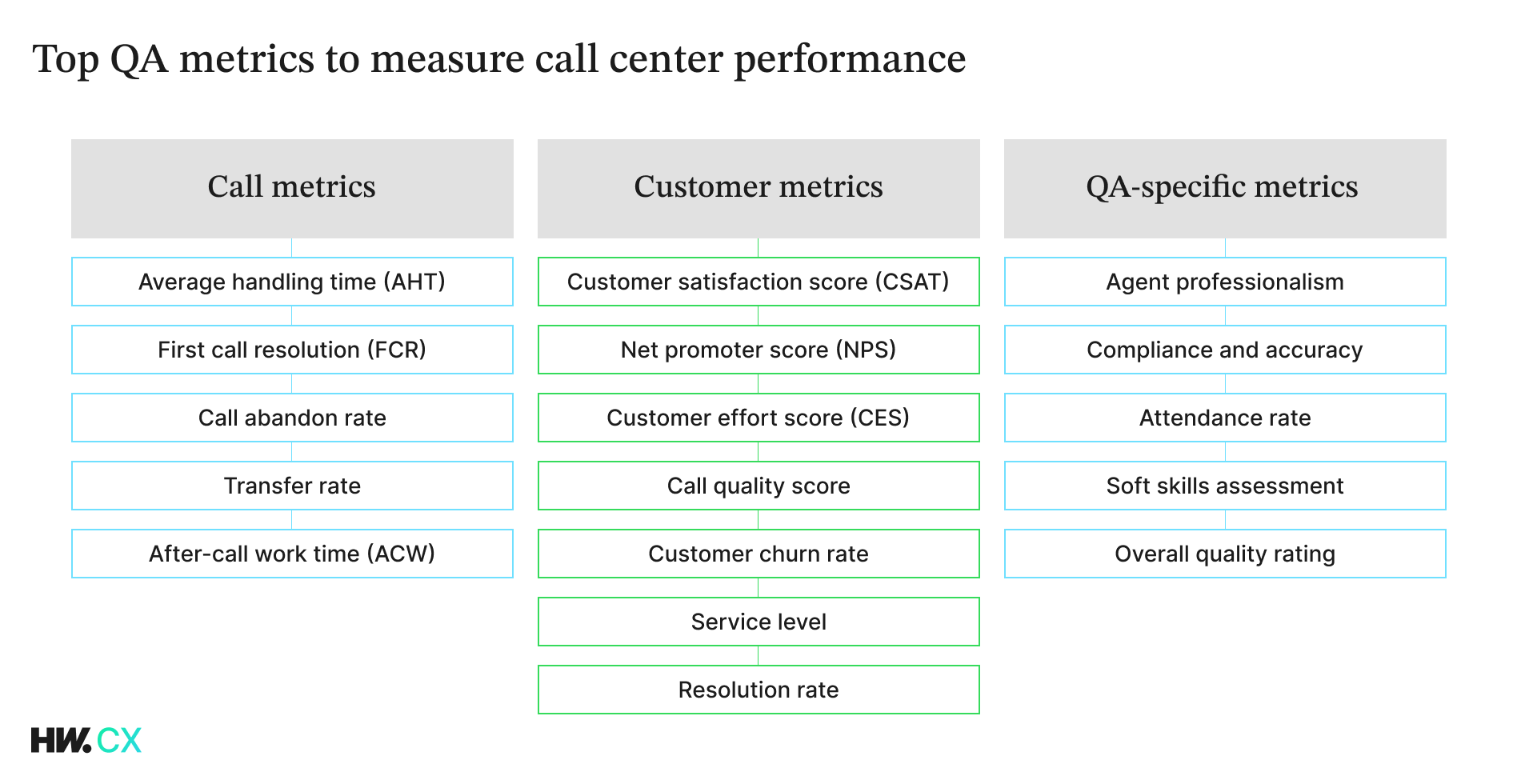 One of the key responsibilities of a quality assurance manager, QA specialist, or contact centre performance specialist is assessing call quality. Call centre quality assurance uses certain metrics to see how effectively agents meet standards and customer expectations.