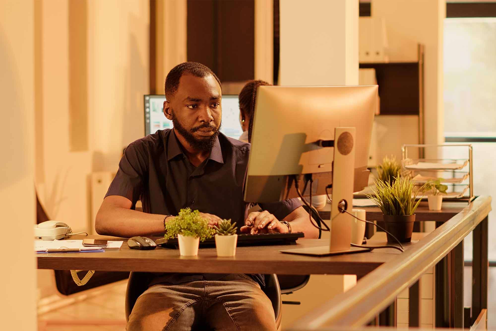 Two men are sitting in ergonomic chairs and working at their computers in a bright office space